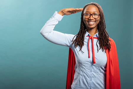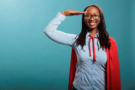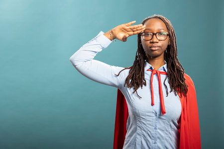 Serious black heroine standing and giving respectful military salutation. Young african american woman in red cape and blue shirt strikes powerful pose, radiating confidence in studio.