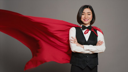 Hotel administrator wearing a red hero cloak on camera, feeling strong and powerful to help clients. Asian receptionist posing with confidence using a superhero cape over grey background. Camera A.