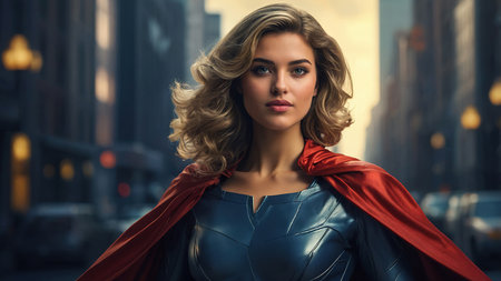 A confident female superhero stands ready for action in a bustling urban setting during golden hour, showing her vibrant costume and cape.