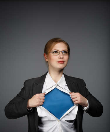 Businesswoman wearing red cape and opening her shirt like superhero