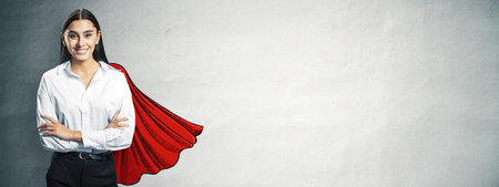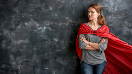Businesswoman with sketched red superhero cape, realistic style, on gray wall background. Concept of leadership, success, and empowerment