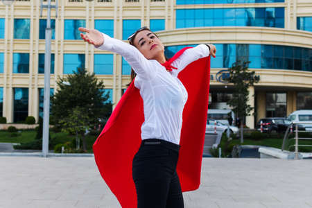 Successful superhero businesswoman in a red cape on a background of blue sky in the city.