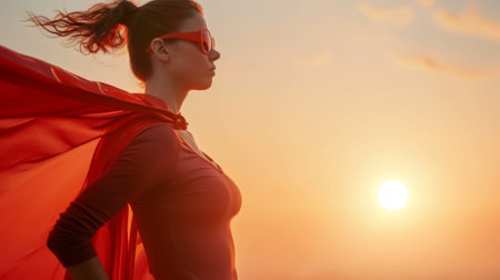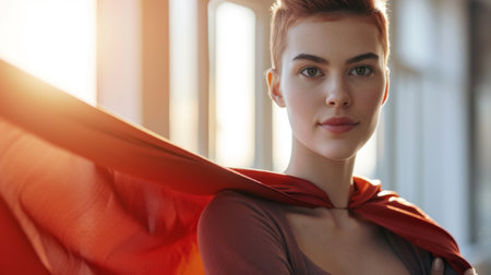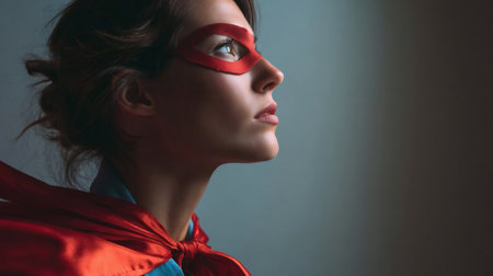Portrait of female superhero wearing red cape costume from cartoon or comic book, showing strength and motivation. Woman posing as hero character with cloak, feeling confident.