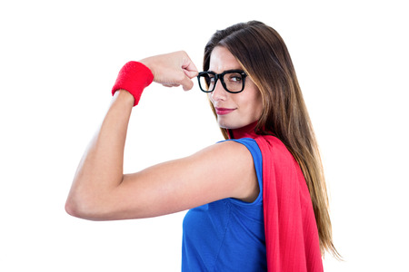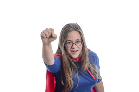 Woman pretending to be a super hero on white background