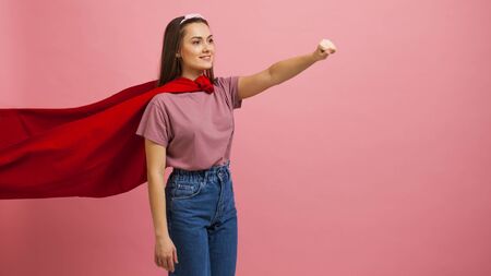 Superheroine, a young female superhero in a red Cape. Everyone can become a hero, a cute young girl in a red raincoat of a comic book superhero in jeans and a t-shirt