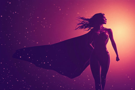 A powerful woman in a superhero costume stands confidently against a vibrant purple and orange cosmic background, embodying strength and resilience