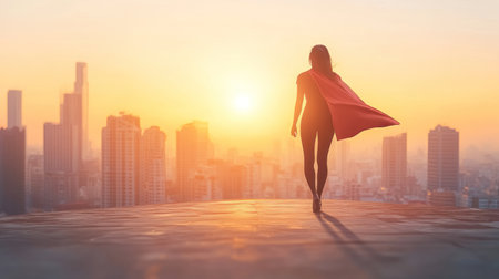 Empowered Businesswoman as Superhero in Futuristic City: Leadership and Success Concept