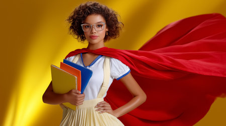 Girl wears red cape and glasses while holding colorful notebooks. Bright yellow backdrop enhances energetic atmosphere. Concept of education, empowerment, creativity.