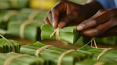 A close-up image shows hands skillfully tying bundles of fresh green leaves at a local market, emphasizing the artistry in natural crafts.