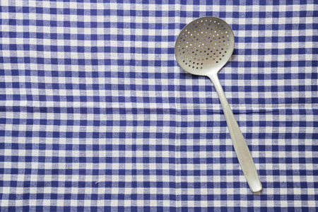 Hand holds a metal slotted spoon. Left hand of a man with a stainless steel product. Caucasian man 43-45 years old. Kitchenware