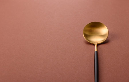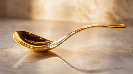 A delicately designed golden spoon is featured on a smooth surface illuminated by warm light.