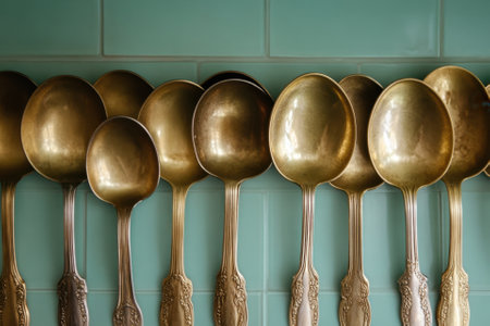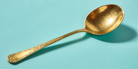 Elegant golden spoon shimmering on a vibrant blue backdrop, perfect for luxury food branding or upscale culinary designs and eye-catching table setting concepts