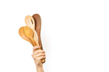 Asian male dark skinned single hand fist finger on black background holding wooden soup spoon