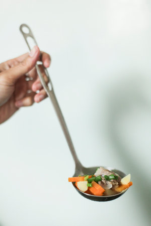 Hand holding noodle soup in dipper isolated on white background, Soup for sukiyaki from chicken and fish