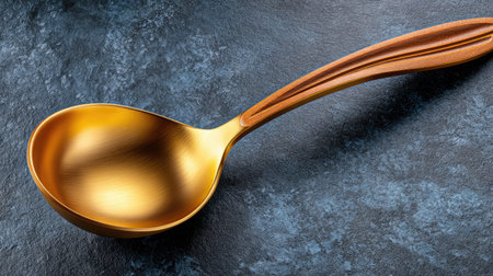 This image showcases an elegant golden spoon featuring a beautiful wooden handle, set on a dark stone surface, ideal for culinary themes and kitchenware collections.