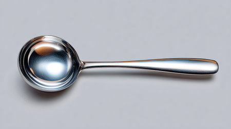 A shiny, polished stainless steel soup ladle is placed on a sleek surface, showing its elegant design and practical use in the kitchen for serving soups and stews.