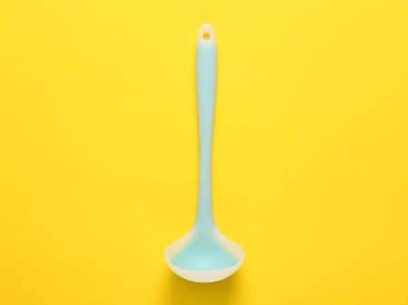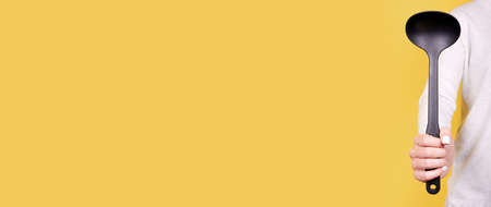 Black plasic ladle in hand, isolated on yellow background, copy space template, banner.