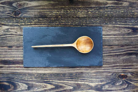 Old handcrafted wooden spoon with deep bowl made of olive wood over a slate stone and rustic wood table background. Image shot from top view. Flatlay.
