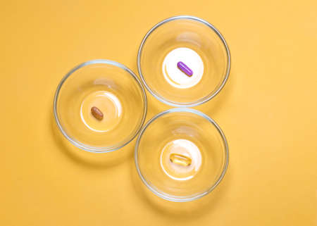 Fish oil omega 3 gel capsules isolated on yellow background. Healthy Nutrition.