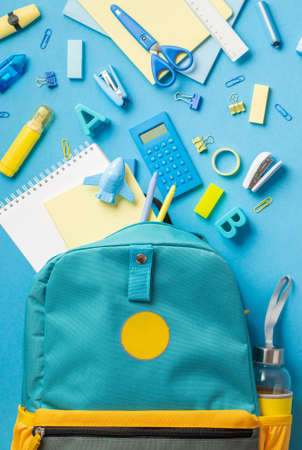 School, backpack varied school supplies. Blue background base and copy space.