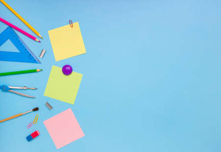 The concept of school and students. Three empty square colored paper for notes. School and office stationery on the edges on a blue background. Top view, free space for text.