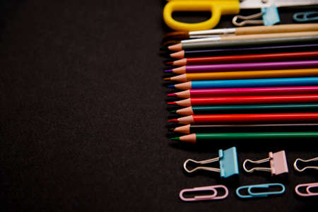 Colored pencils,paper clips, and clips are arranged in a row on a black background. School supplies.
