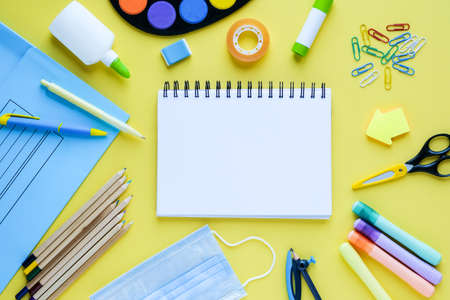 Back to school with school supplies, stationery, medical mask and notebook with empty blank space for kids on yellow desk background,top view flat lay.