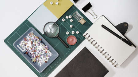 Notebook, magnifying glass and few other stationery objects on white table.View from top.Education concept.