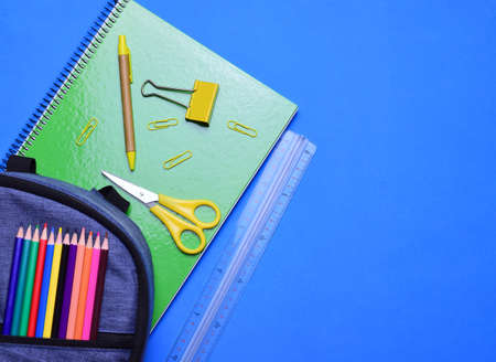 School supplies stationery on a blue background, copy space.