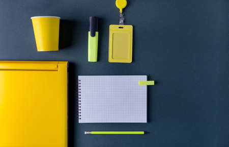 The concept is yellow on black. Yellow paper glass, marker, badge, computer and pencil lie on a black background with a copy of the space and a flat layout