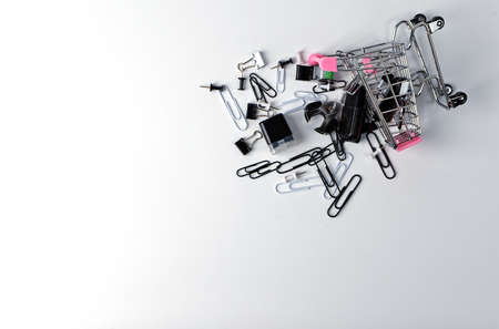 Stationary. Paper clips and other small office supplies fell out of the shopping basket. Stationery purchase concept. Isolate. Copy space. Flat lay.