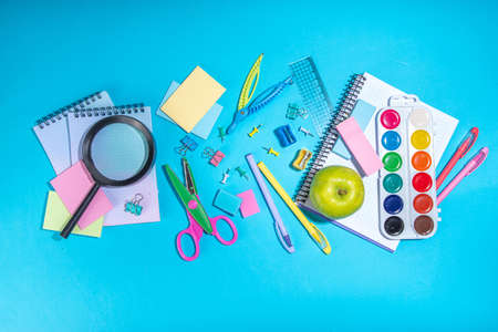 School supplies on blue background. Back to school. Flat lay. Top view