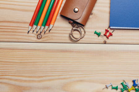 different office supplies for training and creative assignments for the school on the table