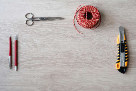 Decorative paper, various strings and ropes for wrapping presents on table of creative person