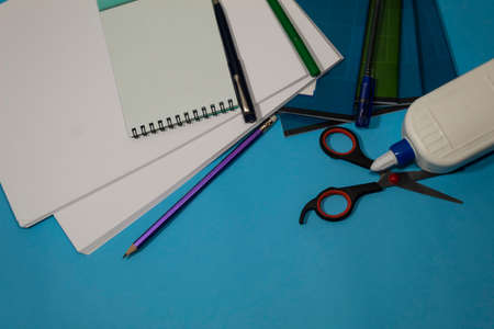 On a blue background are sheets of white paper, notebooks, glue, scissors, pencils, pens.