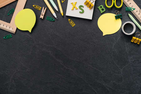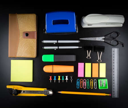 Set of school stationery on dark background