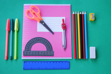 Back to school. Stationery on a green background.