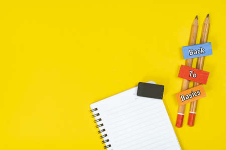 Business concept. Layout of notebook, eraser, pencils and wooden block with text BACK TO BASICS.