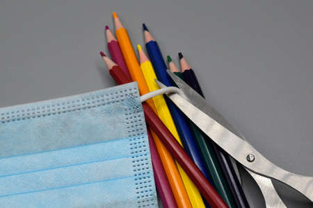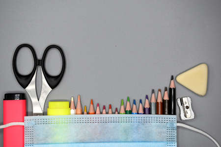 School supplies, colored pencils, pencil sharpener, eraser, markers and scissors at the bottom protected by a surgical mask on top, gray background.