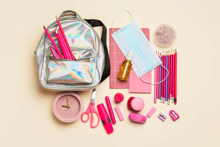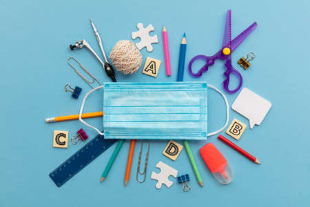 Back to school concept. School supplies with a medical face mask