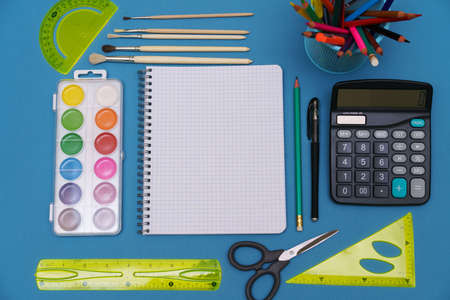 Notebooks, pencils, paints, sharpeners, paper clips - goods for school, office on a blue background