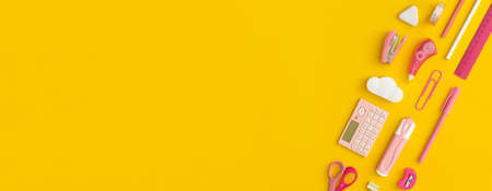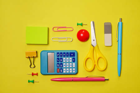 School stationery on a yellow background. Top view with copy space. Flat lay. Back to school concept.