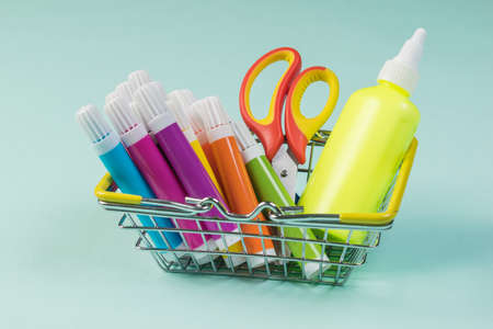 Metal basket with markers, glue and scissors on a light blue background. A set for creativity and implementation of ideas.