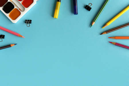 Many stationary supplies on blue background with space for text. Office accessories flat lay. First September, back to school, education, creativity concept. Pens, pencils and paints with copyspace
