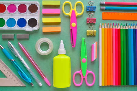 school supplies at colorful paper background