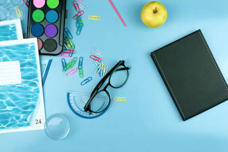 School supplies on a blue background. View from above