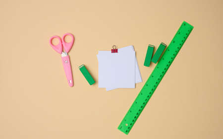 set of stationery objects ruler, blank white paper sheets ina beige background. View from above