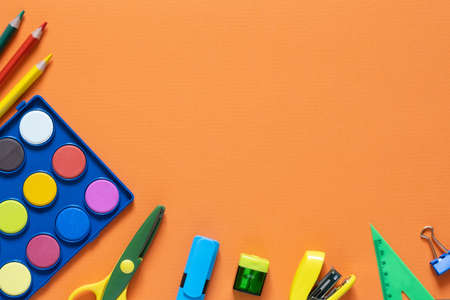 Back to school concept. School and office supplies on the office table. Orange background.Flat lay