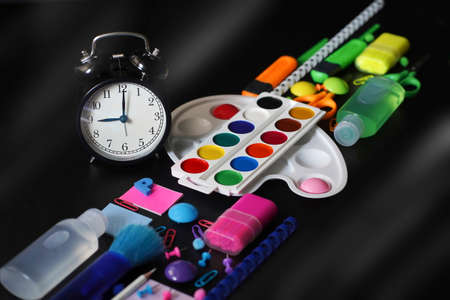 Blurred background of Back To School concept Alarm Clock Blackboard Pencil Stationery on Black Background. Top View Flat Lay, vertical. High quality photo