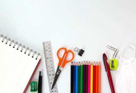 Set of Education elements, colorful pencils, face mask, paper clips, scissors, ruler isolated on white background. Back to school concept